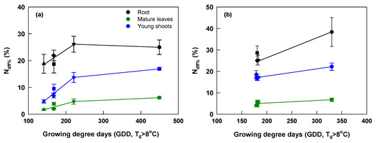 - Dong, S.; Scagel, C.F.; Cheng, L.; Fuchigami, L.H.; Rygiewicz, P.T. Soil temperature and plant growth stage influence nitrogen uptake and amino acid concentration of apple during early spring growth. Tree Physiol. 2001, 21, 541–547. [Google Scholar] [CrossRef] [PubMed] [Green Version]