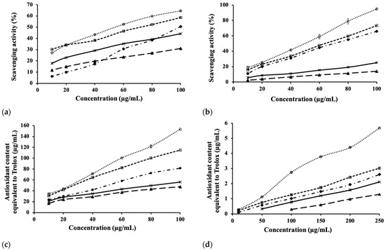 ABTS scavenging ability was observed, in descending order, in the aqueous, ethyl acetate, ethanol, dichloromethane and n-hexane fractions at all tested concentrations (Figure 2b). The ABTS scavenging ability of the extracts was positively proportional to the concentration of the tested extracts.