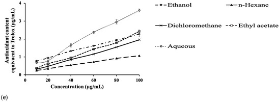 In the TAC assay, Mo (VI) was reduced to Mo (V) by reducing compounds from the extracts, leading to the formation of the green phosphate/Mo (V) complex that was spectrophotometrically recorded at 695 nm. The result is expressed as the antioxidant content equivalent to Trolox (Figure 2c). The TAC of the aqueous extract was the highest at each concentration tested, followed in descending order by the ethyl acetate, ethanol (crude), dichloromethane and hexane extracts.