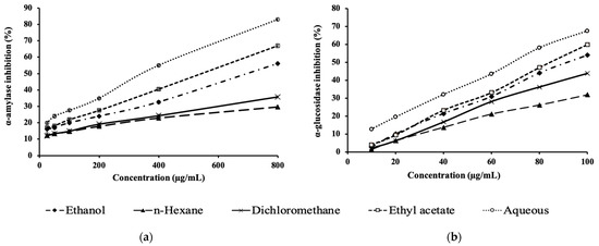 The inhibitory activity of the extracts against α-amylase and α-glucosidase increased with the extract concentrations (Figure 3a,b). Among the five extracts, the aqueous fraction had the strongest inhibitory activity against these enzymes at each tested concentration, followed by the ethyl acetate, ethanol (crude), dichloromethane and hexane extracts.