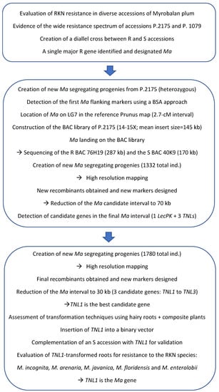 The Ma gene, the first RKN R gene characterized in a perennial, has remarkable biological properties in comparison with the Mi1-2 tomato R gene. As reported earlier the resistance that Ma confers is high and durable, whatever the temperature, and controls all the RKN species attacking the Prunus spp. These remarkable features have justified a positional cloning strategy in order to reveal its structure and function. Within stone fruit crops, it is also the first R gene to be cloned [67,68]. Successive steps to reach this objective are summarized hereafter and in the second part of Figure 1.