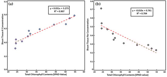 Figure 1 Correlation shows the significance level for shoot Na and K concentration and with total chlorophyll contents (SPAD-value) as affected by foliar application of K on spinach plants exposed to varying levels of salt stress, Shoot Na concentration in spinach leaves increased with increasing SPAD values; however, shoot tissue Na concentration was inversely linked with SPAD values (Figure 1a,b). Membrane and chlorophyll damage were visualized in tomatoes under saline conditions, which was lowered by foliar application of KH2PO4 [60]. The toxic ion consequences of salt on fruit formation in bottle gourd (Lagenaria siceraria) was decreased along with an increase in production by 77% after foliar usage of 250 ppm KNO3 under salt stress [61]. Under salt stress, spraying of foliar of KOH on sunflower amplified K+ concentration along with significant growth and yield elevation [46]. The present study results align with the findings for cucumber, pepper [47], tomato [60], spinach [62] and cotton [63].