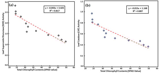 Leaf SOD activity in spinach leaves decreased with increasing SPAD values, similarly, CAT activity in spinach leaves also showed inverse linkage with SPAD values (Figure 2a,b). In the current study the antioxidant enzymes (SOD and CAT) activity was reduced in treatments where sufficient K nutrition was applied. It has been suggested that the ROS production can be decreased to a greater extent with the improved status of K nutrition in plants as improving K nutrition helps reduce activity of NAD(P)H oxidases and maintains photosynthetic electron transport; as a result, the activity of antioxidant enzymes reduces with K application [25,74].