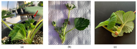 The inflorescence structure and daughter plant of strawberry plant ‘Albion’. (a) An inflorescence to be counted with visible stalk and flower bud. The arrow points to the flower bud. (b) An inflorescence to be removed with visible primary flower and elongated stalk. (c) A strawberry (‘Albion’) daughter plant (runner tip) with three fully expanded leaves and visible rootlets [3].