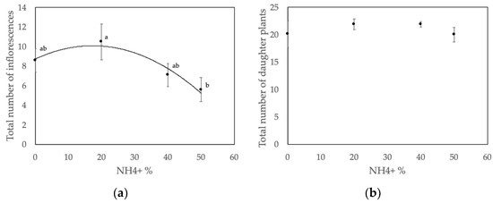 Average number of inflorescences and daughter plants under increasing percentage of NH4+ (the remainder being NO3−). (a) Average number of inflorescences (Infl) produced under increasing percentage of NH4+. Shown are the mean and standard error (n = 10). Data were analyzed with regression analysis and fitted in a quadratic regression line: Infl = 12.16 − 0.09 NH4 − 0.005 NH42 (p-value = 0.05). Letters indicate the mean separation between treatments (Tukey HSD, α = 0.05, p-value = 0.05). (b) Average number of daughter plants harvested under increasing percentages of NH4+. Shown are the mean and standard error (n = 10). No significant differences were found.