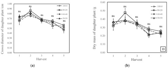 Average crown diameter and dry mass of daughter plants over five harvest days across the four treatments. (a) Average crown diameter (cm) of daughter plants harvested in all treatments. Shown are the mean and standard error. No significant difference was found. (b) Average dry mass (g) over five harvest days across the four treatments. Shown are the mean and standard error. No significant differences were found.