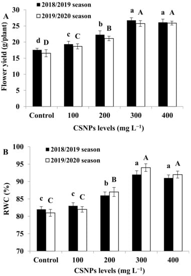 The dry flower yield in response to CSNPs levels was presented in Figure 1A. The flower yield was significantly enhanced as a result of any CSNPs level compared to the control during the two seasons of study. The increase in the concentration of CSNPs, the increase in the flower yield, however there is no significant difference between 300 and 400 mg L−1 treatments in this respect. Chamomile plants that sprayed with 300 mg L−1 CSNPs increased flower yield by 52.10 and 55.74% in both seasons, respectively.