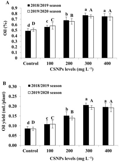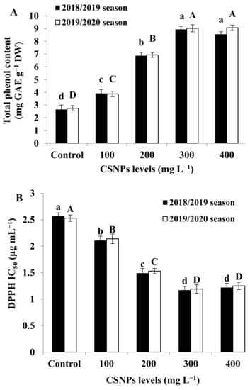 Foliar application of CSNPs considerably increased the total phenolics in comparison to the untreated plants during the two seasons of study (Figure 3A). A progressive increase in phenolic content was observed with the increasing the CSNPs levels. The highest total phenolics were obtained by the treatment of 300 mg L−1. By applying this treatment, the total phenolics were 8.94 and 9.03 mg GAE g−1 DW compared to 2.66 and 2.75 mg GAE g−1 DW recorded by the control during the two seasons, respectively.