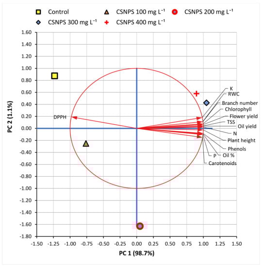 Biplot of the principal component analysis (PCA) for chamomile plant parameters in response to CSNPs treatments. The first two principal components (PC1 and PC2) explained 99.8% of the total variation. The circle represents perfect (maximum) correlation (±1). The vectors (arrows) represent the variables, and the colored shapes represent sampling points under various treatments of CSNPs and the control.