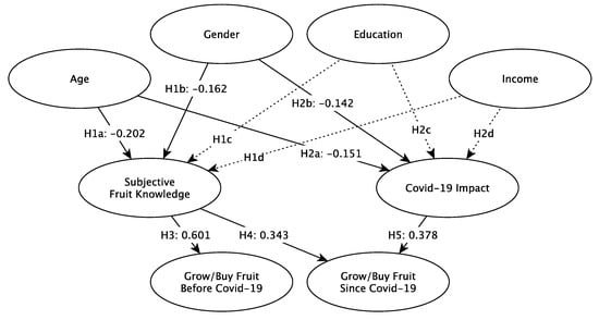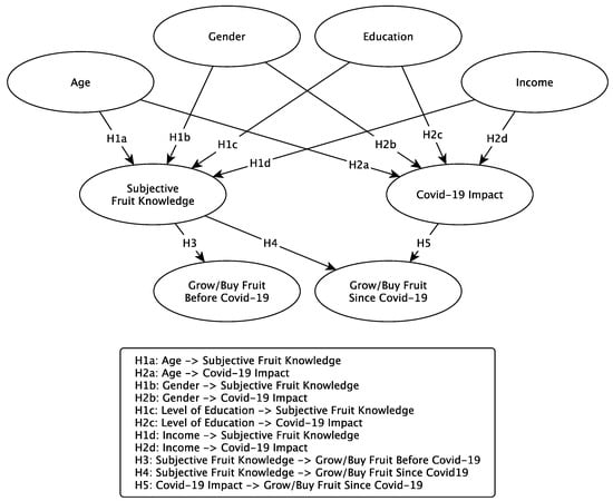 Table 4 and Figure 2 show the results of the hypothesis testing. Age and gender were significantly related to subjective fruit knowledge and COVID-19 impact, supporting H1a, H1b, H2a and H2b. Income and level of education were not significantly related to subjective fruit knowledge or COVID-19 impact, so no support was found for H1c, H2c, H1d or H2d. H3 and H4 were supported as subjective fruit knowledge was significantly related to the growing of fruit or buying of fruit before and during COVID-19, and the perceived impact of COVID-19 was significantly related to the growing of fruit or buying of fruit since COVID-19, supporting H5.
