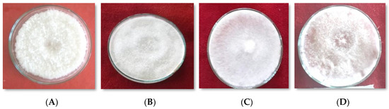 Colony characteristics of F. oxysporum f. sp. lentis; (A) 7-day old colony; (B) 15-day old colony; (C) 25-day old colony; (D) 35-day old colony.