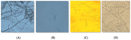 Morphological characteristics of F. oxysporum f. sp. lentis (A) Mycelium; (B) Microconidia; (C) Macroconidia; (D) Chlamydospores (×400).