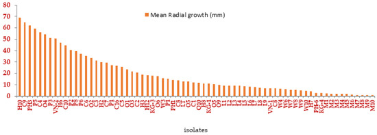 Among the seventy bioagents evaluated using the poison food technique, the highest radial growth (mm) was observed in isolate H10 (69 mm) followed by isolate C9 (65 mm) after 5 days of incubation on PDA amended with 2500 ppm copper oxychloride. The most negligible radial growth was observed in isolate M10 (1.0 mm) (Figure 4 and Table 2).