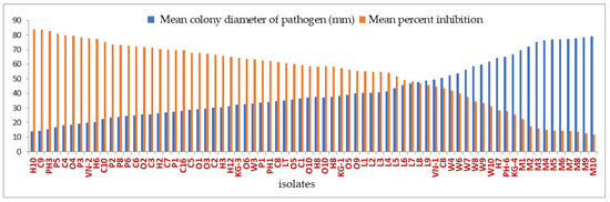 In vitro efficacy of bioagents (x-axis isolate name from H10 to M10) against mycelial growth of F. oxysporum f. sp. lentis.