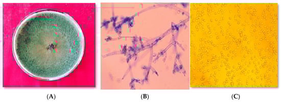 Morphological characteristics of bioagent TAB-2; (A) 7 days old culture; (B) phialids; (C) conidia(×400).