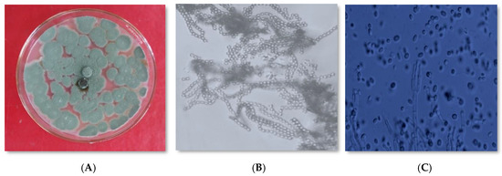 Morphological characteristics of bioagent TAB-1; (A) 7 days old culture; (B) phialids; (C) conidia(×400).