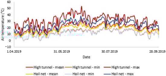 Mean, minimum, and maximum air temperatures under the high tunnel and hail net conditions through the growing season from 1 April to 30 September 2019.