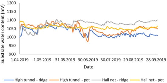 Substrate water content under the high tunnel and hail net conditions for the ridge and pot planting systems through the growing season from 1 April to 30 September 2019.