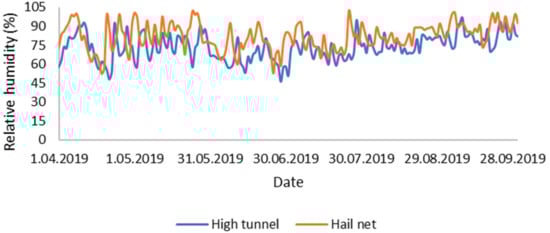 Relative air humidity under the high tunnel and hail net conditions through the growing season from 1 April to 30 September 2019.