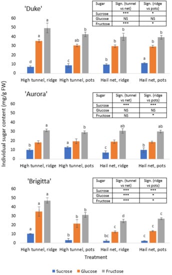 Blueberry fruit sucrose, glucose, and fructose contents for ‘Duke’, ‘Aurora’, and ‘Brigitta’ plants grown under the high tunnel and hail net conditions in the ridge and pots. Different letters indicate statistically significant differences between treatments for individual sugars. Sign. (tunnel vs. net), significance between protected environments within each cultivar (Duncan tests; α < 0.05). Sign. (ridge vs. pots), significance between planting systems within each cultivar (Duncan tests; α < 0.05). NS, not significant; *, p < 0.05; ***, p < 0.001 (Duncan test, α < 0.05).