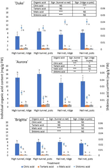 Blueberry fruit citric, tartaric, malic, and shikimic acid contents for ‘Duke’, ‘Aurora’, and ‘Brigitta’ plants grown under the high tunnel and hail net conditions in the ridge and pots. Different letters indicate statistically significant differences between treatments for individual organic acids. Sign. (tunnel vs. net), significance between protected environments within each cultivar (Duncan tests; α < 0.05). Sign. (ridge vs. pots), significance between planting systems within each cultivar (Duncan tests; α < 0.05). NS, not significant; *, p < 0.05; **, p < 0.01; ***, p < 0.001 (Duncan test, α < 0.05).