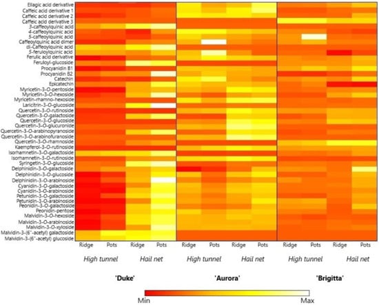 Heatmap for blueberry fruit individual phenolics contents for ‘Duke’, ‘Aurora’, and ‘Brigitta’ plants grown under the high tunnel and hail net conditions in the ridge and pots.