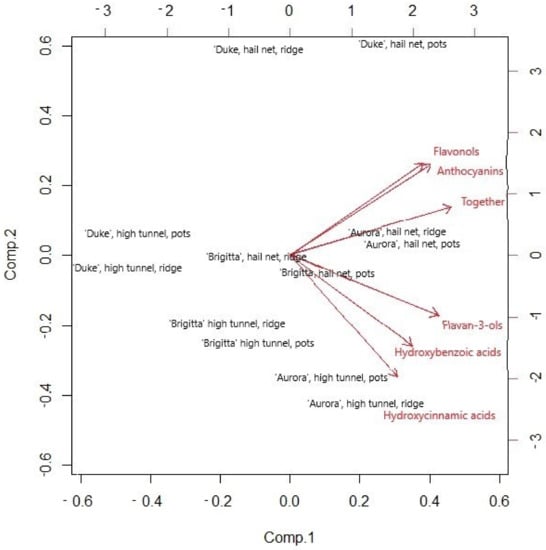 Principal component analysis of the blueberry fruit contents for the individual groups of phenolics for ‘Duke’, ‘Aurora’, and ‘Brigitta’ plants grown under the high tunnel and hail net conditions in the ridge and pots.
