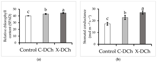 As shown in Figure 1, SPAD chlorophyll meter measurements and stomatal conductance were significantly increased due to C-DCh and X-DCh treatment in comparison to control. The C-DCh increased SPAD and stomatal conductance by 11% and 55%, and X-DCh by 7% and 31%, respectively. The SPAD and stomatal conductance of plants treated with X-DCh were 3% and 19%, respectively, greater than that of C-DCh treatment.