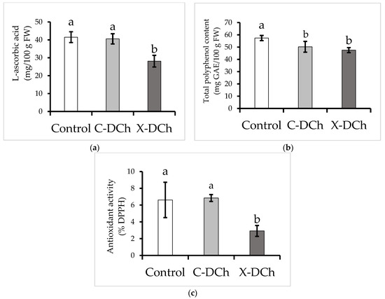 Figure 2 shows the effects of bulb coatings on the content of L-ascorbic acid and total polyphenols and the antioxidant activity. In comparison with the control the application of C-DCh or X-DCh significantly decreased total polyphenol content by 13% and 17%, respectively. Furthermore, the application of X-DCh significantly decreased L-ascorbic acid content by 33% and free DPPH radicals by 56%. The plant L-ascorbic acid content and antioxidant activity showed no statistically significant differences between control and C-DCh treatment.