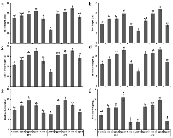 Morphological variables [i.e., shoot length (a), root length (b), shoot fresh weight (c), shoot dry weight (d), root fresh weight (e), root dry weight (f)] of tomato plants (cv. Ahmar) as affected by temperature and exogenous application of S. Same letters indicate non-significant differences among treatments according to Tukey’s honestly significant difference test (p ≤ 0.05). Vertical bars indicate averages ± standard errors (n = 4, 5 plants per replicate).