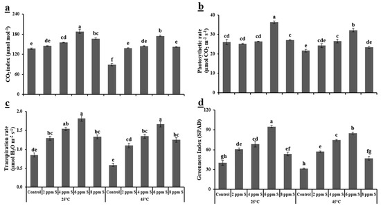 The transpiration rate significantly increased with the foliar application of S. In both growth chambers, the maximal transpiration rates were exhibited by the plants treated with 6 ppm S (1.8 µmol H2O m−2 s−1 at 25 °C and 1.7 µmol H2O m−2 s−1 45 °C) (Figure 2c). Similarly, plants receiving foliar application of 6 ppm S showed 137% and 168% increases in greenness index values at 25 °C and 45 °C, respectively (Figure 2d).