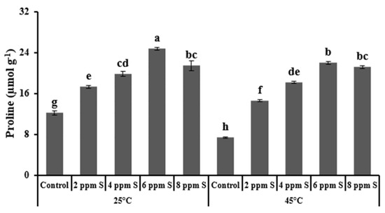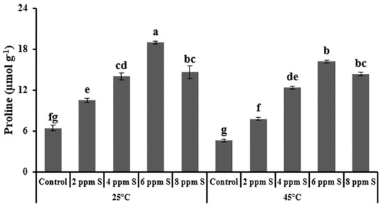 Tomato plants treated with 6 ppm S showed maximal leaf proline contents (24.8 µmol g−1) under normal temperature (25 °C) conditions, followed by heat stress (45 °C). The leaf proline contents increased with S application in a dose-dependent manner under heat stress (Figure 3).