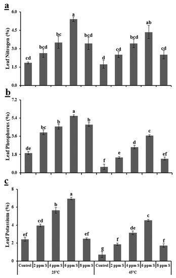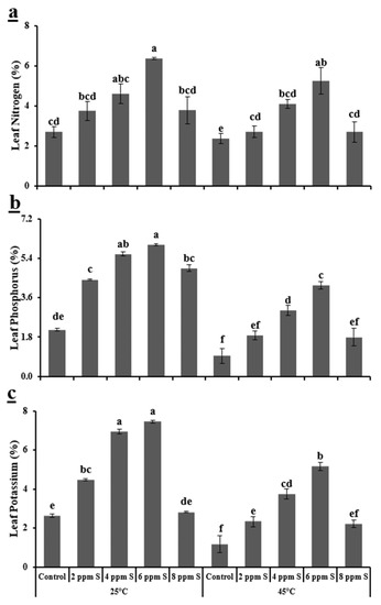 Similarly, tomato plants treated with 6 ppm S showed maximal leaf contents of nitrogen, phosphorus, and potassium (6.4%, 6%, and 7.4%, respectively) under normal temperature conditions (25 °C), followed by heat stress conditions (45 °C). Regarding N levels, plants from both growth chambers showed non-significant differences amongst each other, except the plants not treated with S under heat stress conditions (Figure 4a). Plants treated with 6 ppm S exhibited 2.8- and 4.3-fold increases in leaf P contents under 25 °C and 45 °C conditions, respectively (Figure 4b). Similarly, K levels significantly increased with the exogenous application of S under both temperature conditions (Figure 4c).