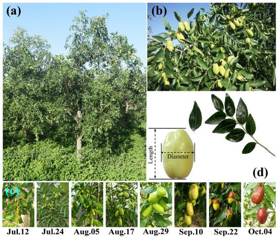 The adult tree of ‘Lingwu Changzao’ (a), fruit and leaves (b), fruits on the sampling dates (c), and an illustrative measurement for fruit length and diameter (d).