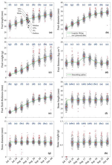 Box plots the measuring results of the 8 selected traits of ‘Lingwu Changzao’ fruit, including (a) fruit length, (b) fruit diameter, (c) fruit weight, (d) fruit firmness, (e) fruit flesh thickness, (f) stone length, (g) stone diameter, and (h) stone weight. Logistic growth curves or Smoothing-spline regression curves are presented with dashed green lines. The blue characters indicate multiple comparison results. * Stone weight measurements cannot be performed on 12 July, because the seed coat tissue was not formed, such that the complete fruit stones cannot be obtained.
