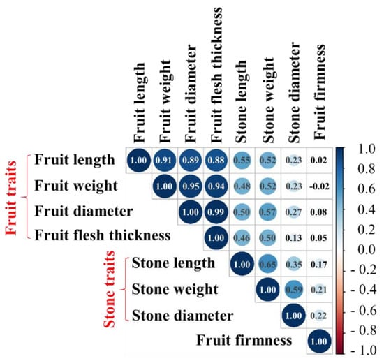 Fruit firmness is presented in Figure 2d. The values were roughly constant at the beginning, then increased to the maximum on 17 August; after that, fruit firmness values gradually decreased to a stable value. Such a pattern was different from any other morphological traits considered in this study. Hence, the correlation coefficients between fruit firmness and other traits achieved relatively small values (Figure 3).