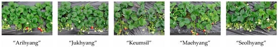 Most strawberries in South Korea are cultivated in greenhouses. Protected cultivation has provided efficient ways to overcome climatic problems such as intense solar radiation, wind, heavy rain, frost, and hail []. Furthermore, the greenhouse environment can be maintained with the required water vapor, CO2 concentration, and airflow conditions []. Therefore, greenhouse cultivation has facilitated crop management and monitoring, sensor installation, and data collection for a long time. For instance, Park et al. [] determined and simulated the number of strawberry transplants without outside weather disturbance for one year. Determining plant growth and productivity in a similar manner can help our understanding of the characteristics of new June-bearing strawberry cultivars. New varieties continue to be bred in South Korea, and their characteristics are being actively studied because strawberry breeding goals in Korea include weak dormancy, vigorous growth, high yield, and fruit quality []. The goals will probably give a common character to the bred cultivars, but we believe that each cultivar will exhibit its own characteristics for a given environment.