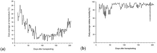 The number of leaves, plant height, leaf length and width, and crown diameter were evaluated once every 2 weeks from the sixth day after transplanting, and the days to flowering were evaluated from 5 November 2019. The fruits were harvested from 26 November 2019 to 19 March 2020. Three plants in five replicated experiment plots (n = 15) were selected at random for data collection. The methods for measuring plant height, leaf length, and width were completed as previously reported [].
