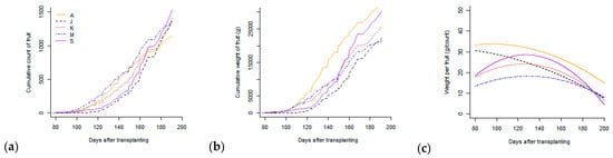 The cumulative count (left), cumulative weight (middle), and estimated weight per fruit by second-order regression (right) of the tested five strawberry cultivars during the season. (a) Cumulative count of fruit; (b), cumulative weight of fruit; (c), weight per fruit. A: “Arihyang,” J: “Jukhyang,” K: “Keumsil,” M: “Maehyang,” and S: “Seolhyang.”