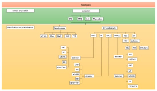 Diagram of the analytical methods to determine the phenolic compounds in roselle. Abbreviations: SFE: Supercritical Fluid Extraction, MAE: Microwave-Assisted Extraction, UAE: Ul-tra-sound-Assisted-Extraction, UV-Vis: ultra-violet-visible, NMR: nuclear magnetic resonance, NIR: near-infrared spec-troscopy, FTIR: Fourier Transform Infrared Spectrometer, HPLC: high-performance liquid chromatography, LC: liquid chromatography, UPLC: ultra-performance liquid chromatography, UHPLC: ultrahigh-performance liquid chromatog-raphy, TLC: thin-layer chromatography, GC: gas chromatography, DAD: diode array detector, PDA: photodiode array detector, MS: mass spectrophotometry, ESI: electrospray ionization, TOF/QTOF: quadrupole time-of-flight, FID: flame ionization detector.