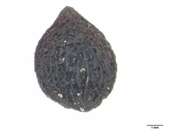 There were 20 incompletely developed fruit among the 103 fruits collected (19.42%). The length of the carpopodium ranged from 4.2 to 6.5 cm (mean 5.2 cm). The diameter of the carpopodium was 7–10 mm (mean 8.4 mm). The mean length of the fruit was 5–7 cm (mean 5.2 cm), and its width was 3.6–5.0 cm (mean 4.4 cm). The length of the carpel was 1.1–2.3 cm (mean 1.8 cm) and the width was 0.6–1.3 cm (mean 1.0 cm). There was an average of 33 carpels, 210 developed seeds and 85 aborted seeds among the randomly selected 20 fruit, which means the abortion percentage was 28.9%. Detailed information is shown in Table 2. Appearance of the seed is shown in Figure 1.