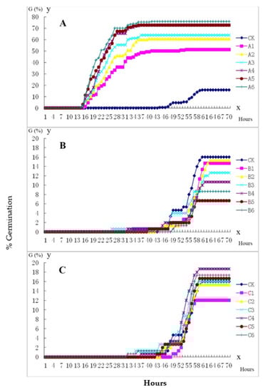 Seed germination responded to IAA in a more complex manner. The G of C3 (100 mg·L−1) IAA was the same as that of ck (Figure 2C). When the concentration was lower than C3, IAA inhibited seed germination. The less IAA the lower the germination rate until C1 (20 mg·L−1), in which the least seeds germinated. However, IAA can slightly improve seed germination if its concentration is higher than that of C3 (Figure 2C).