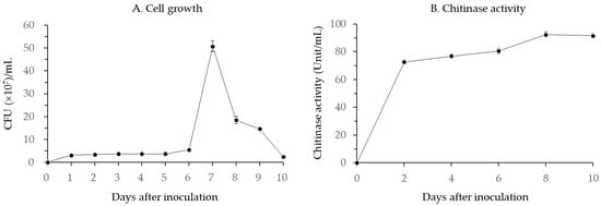 (A) Cell growth pattern and (B) chitinase activity of B. licheniformis PR2.