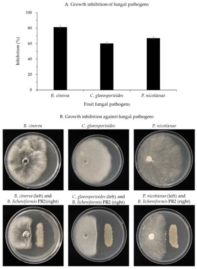 (A) Inhibition of mycelial growth and (B) antagonistic activity of B. licheniformis PR2 against fungal pathogenic B. cinerea, C. gloeosporioides, and P. nicotianae by the dual culture method.