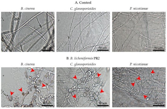 Light microscope images showing hyphal morphologies of B. cinerea, C. gloeosporioides, and P. nicotianae: (A) control and (B) treatment with B. licheniformis PR2. Arrows indicate abnormal structures caused by B. licheniformis PR2.