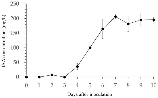 B. licheniformis PR2 produced auxin (Figure 5). The IAA concentration increased on the 4th day of inoculation, eventually reaching a maximum value of 206.3 mg/L on the 7th day (Figure 5). IAA concentration remained relatively stable from the 9th to the 10th day after inoculation.