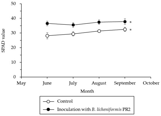 Statistical analyses were performed to determine the effects of B. licheniformis PR2 on chlorophyll content, fruit rotting rate, fruit characteristics, and yields using SAS software, version 9.4 (SAS Institute Inc., Cary, NC, USA). Results are reported as mean ± standard deviation based on Student’s t-test with significance set at p < 0.05.