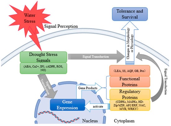 Drought is one of the most important factors restricting agricultural production, which seriously affects crop yield [1,2]. Moreover, as one of the main restraining factors in the process of plant growth, drought can hinder plant respiration, photosynthesis, and stomatal movement; thus, affecting plant growth and physiological metabolism. In response to drought stress, plants activate their drought response mechanisms, such as morphological and structural changes, expression of drought-resistant genes, synthesis of hormones, and osmotic regulatory substances to alleviate drought stress. To better reveal the mechanism of drought resistance of plants, based on a lot of previous work, we summarized the status quo and progress of studies on the morphological structure, physiological and biochemical mechanism changes, internal signal transduction system, and molecular regulation mechanism of plants under drought stress in recent years. Under drought conditions, plants sense water stress signals and produce signal molecules, such as abscisic acid (ABA), Ca2+, inositol-1, 4, 5-triphosphate (IP3), cyclic adenosine 5′-diphosphate ribose (cADPR), NO, etc., and directly or indirectly lead to the morphological and physiological changes of plants through signal transduction. Indirectly, drought stress signals induce the expression of downstream genes. Functional gene products, such as proline (pro), glycine betaine (GB), soluble sugar (SS), late embryogenesis abundant (LEA) proteins, and aquaporin (AQP) can be involved in plant metabolism and, thus, affect plant state. Regulatory gene products, such as calcium-dependent protein kinases (CDPKs), mitogen-activated protein kinases (MAPKs), HD-zip/bZIP, AP2/ERF, NAC, MYB, and WRKY can cause changes in plant morphology or physiology by regulating signal transduction pathways or acting as transcription factors to regulate the expression of downstream genes, and further enable plants to successfully survive in the arid environment (Figure 1).