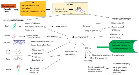 Figure 1. Water stress-induced morphological and physiological changes. (−) reduction due to water stress; (+) increase due to water stress. abscisic acid (ABA); malondialdehyde (MDA); reactive oxygen species (ROS); water use efficiency (WUE).