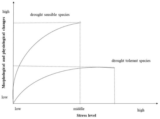 Figure 2. Graphic representation of morphological and physiological changes in drought-sensible and drought-tolerant ornamental plants as water stress level increases.